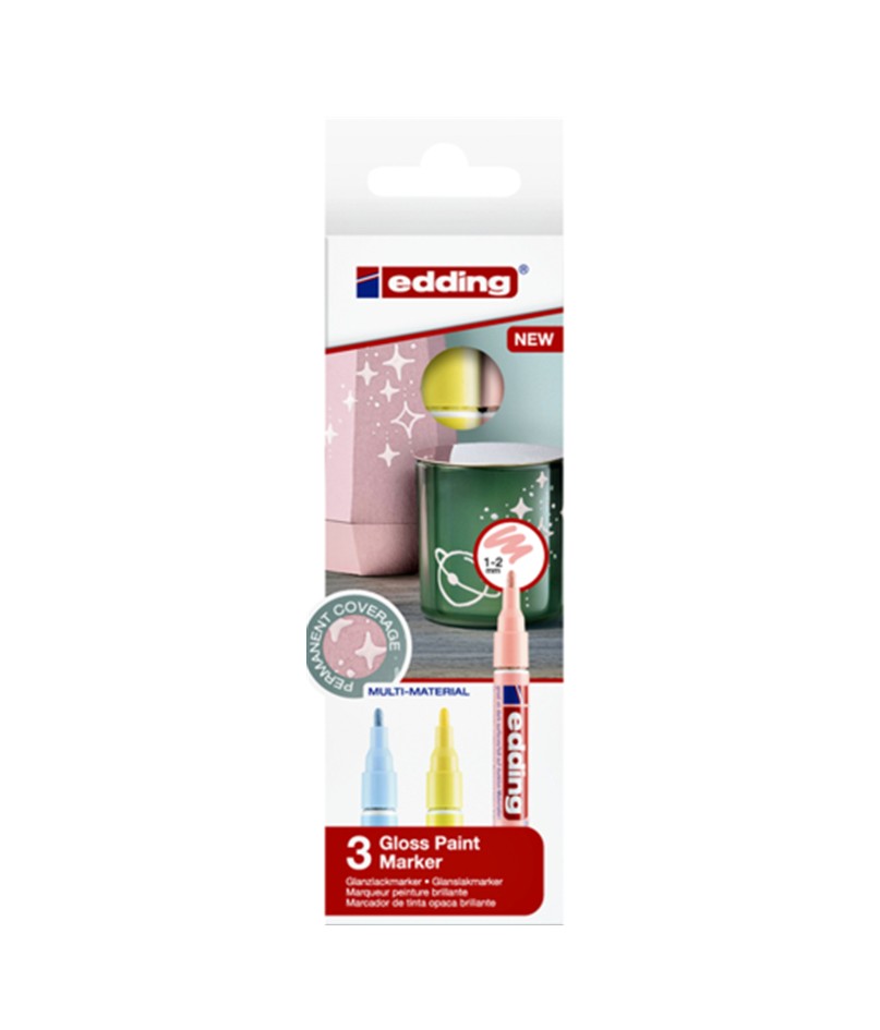 Edding glanslakmarker met lakachtige dekking. Hecht permanent en dekkend op praktisch alle materialen, ook op donkere en transparante ondergronden en glas. Zeer geschikt om te decoreren. Ronde punt. Reukarm. Schrijfbreedte 1-2mm.