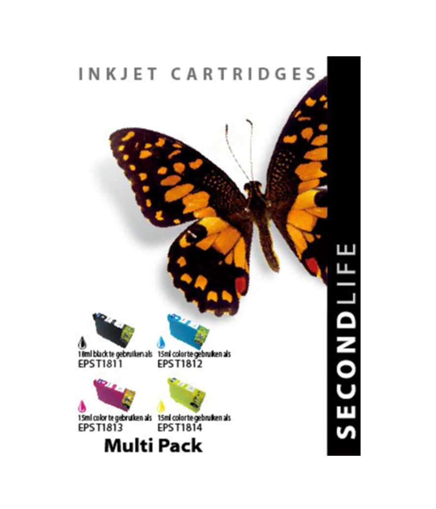 Meer printen voor minder geld met de cartridges van SecondLife. Deze cartridges zijn na hun eerste, originele leven op milieuvriendelijke wijze geherfabriceerd en bevatten nu ook meer inkt dan het origineel. Op deze Cartridge SecondLife Epson 18 XL (T 1816) multipack bieden wij 100% kwaliteit in contrast, 100% kwaliteit in helderheid en 100% garantie op technische defecten. Grotere inhoud Zwart (18ml v.s.11ml) je print gemiddeld 750 pagina’s. Grotere inhoud Kleur (15ml v.s. 6,6ml) je print gemiddeld 1150 pagina’s.